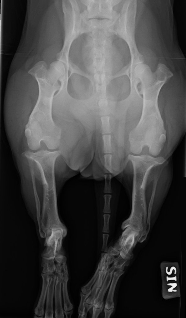 Kuva 1: Vasemman (SIN) takajalan pes varus yhdeksän kuukauden ikäisellä karkeakarvaisella mäyräkoiranartulla. Jalan alaosa taipuu kintereestä voimakkaasti sisäänpäin.