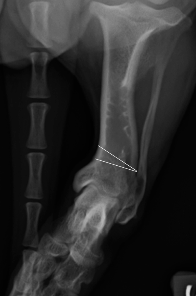 Vanhemmilla koirilla ontumisen syynä voi olla epämuodostuneeseen niveleen kehittyvä nivelrikko. Kasvulinjojen liian aikainen sulkeutuminen voi johtua tapaturmasta, mutta useimmiten se tapahtuu mäyräkoirilla ilman tapaturmaa ja sitä pidetään niillä perinnöllisenä. Perinnöllisyysmekanismista ei ole tietoa.