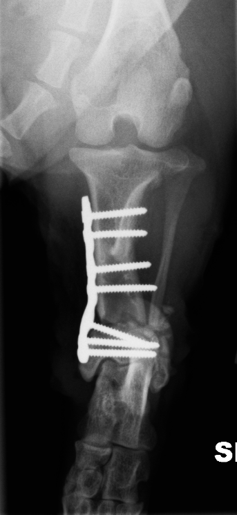 Diagnoosi voidaan varmistaa röntgenkuvauksella ja sairauden hoito on kirurginen. Sääriluun alapää katkaistaan ja luusta poistetaan kolmion muotoinen pala (kuva 2) niin, että jalka saadaan suoraan asentoon. Jalkaan asetetaan metallilevy (kuva 3A), joka poistetaan myöhemmin, kun leikkauskohta on täysin luutunut (kuva 3B). Fysioterapia leikkauksen jälkeen nopeuttaa paranemista. Ajoissa tehdyn leikkauksen ennuste on hyvä, ja suurin osa koirista elää leikkauksen jälkeen normaalin ontumattoman elämän.