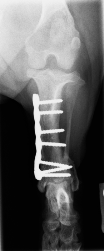 Kuva 3: Heti leikkauksen jälkeen otettu röntgenkuva, jossa näkyy, kuinka jalan akseli on nyt suora (A) ja kolme kuukautta myöhemmin ennen levyn poistoa otettu röntgenkuva, jossa nähdään, että sääriluu on täysin luutunut ja jalka on oikeassa asennossa (B).